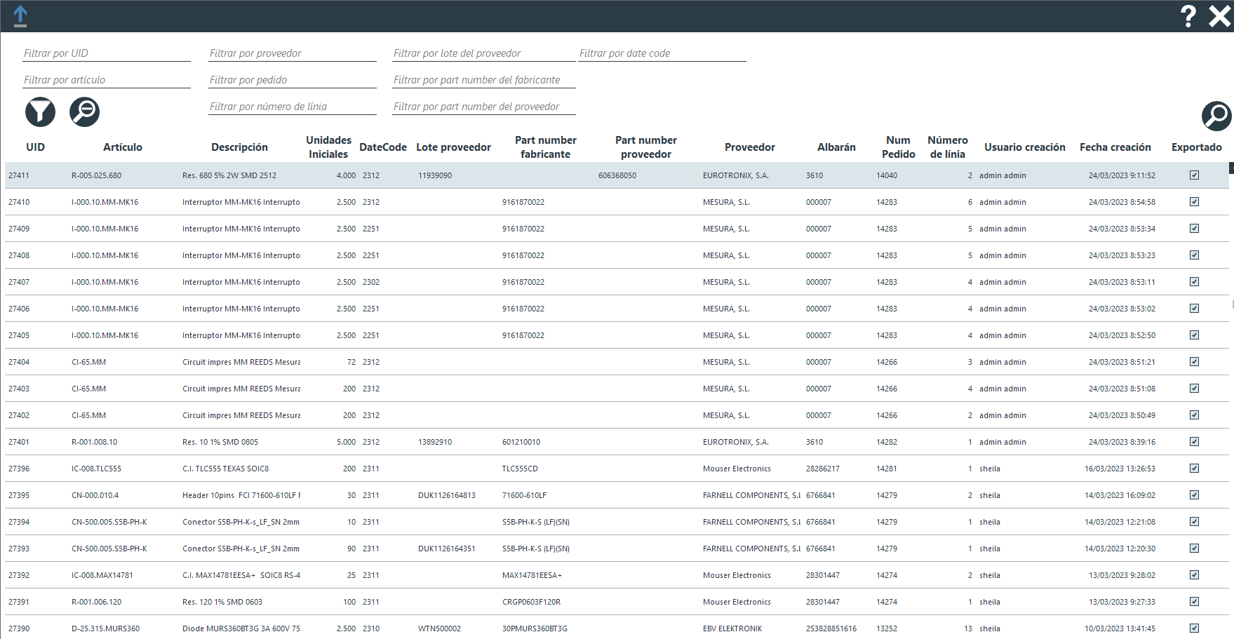 En esta ventana, puedes realizar un filtrado para encontrar un UID específico o utilizar los campos del control número 1 para encontrar todos los UID que coincidan con el filtro. Esto te permite, por ejemplo, extraer todos los UID que pertenezcan a un mismo pedido, que tengan un mismo lote de proveedor, etc.