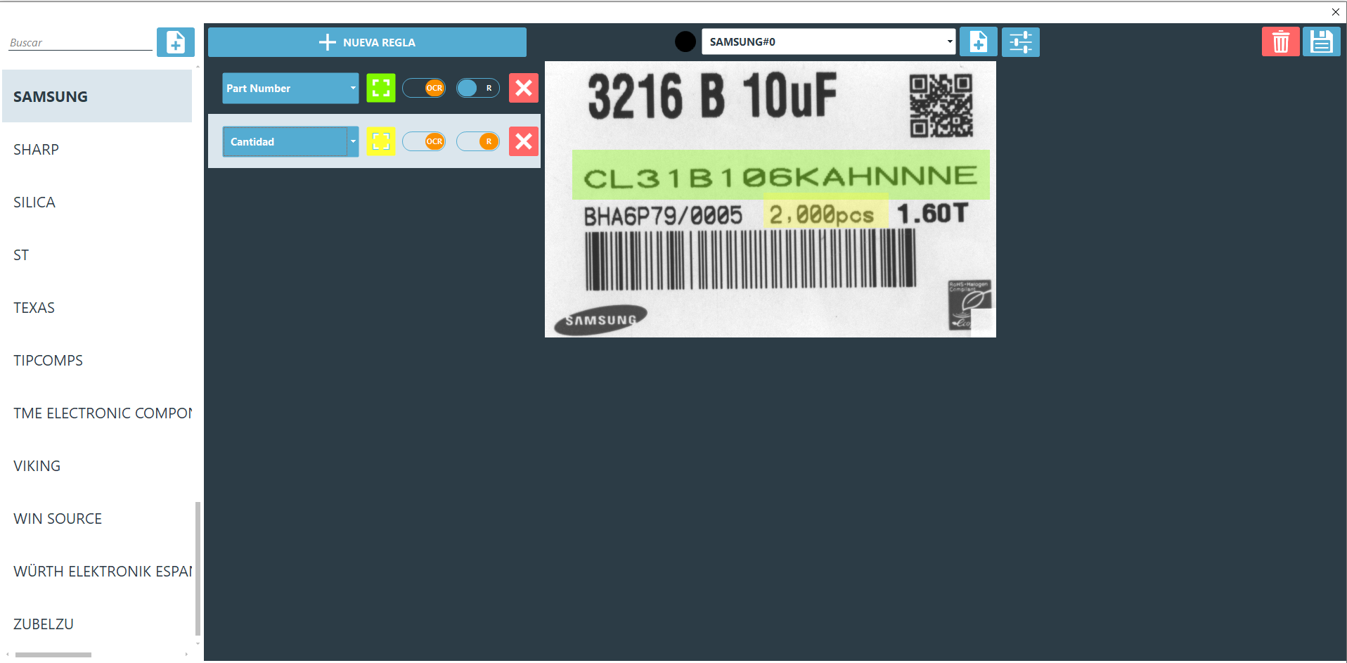 Lectura por prefijos: Se basa en los estándares de prefijos establecidos. Cada prefijo indica el tipo de información que se encuentra en la etiqueta, como el Part Number de proveedor (1P), Part Number (P), cantidad (Q), DateCode (9D o 10D), lote (1T), MSL (Z).