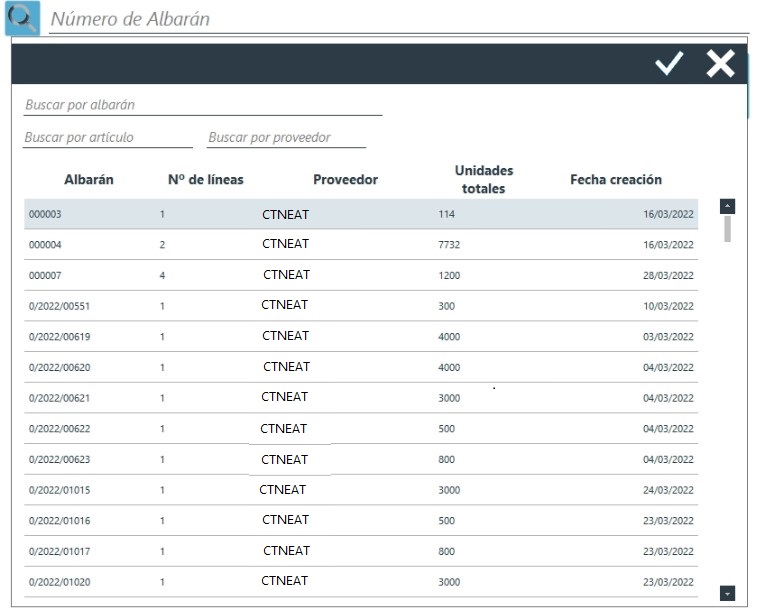 . Se generará un desplegable con los últimos albaranes recepcionados y podremos seleccionar el nuestro. Podremos filtrar por albarán, artículo y proveedor. Además, encontraremos información de los albaranes, como unidades totales, proveedor o fecha de creación.