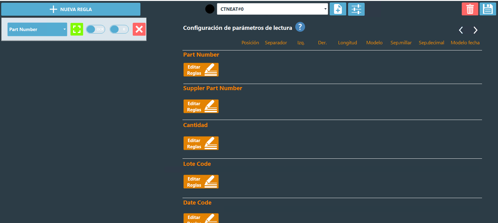Es posible configurar la manera en que las reglas son leídas para adaptarse a diferentes escenarios. Esto incluye situaciones en las que los parámetros de una etiqueta se encuentren concatenados en un mismo código, cuando los parámetros contengan un prefijo no deseado o si el parámetro de cantidad o fecha no está en el formato correcto. Para configurar las reglas de lectura, sigue estos pasos: