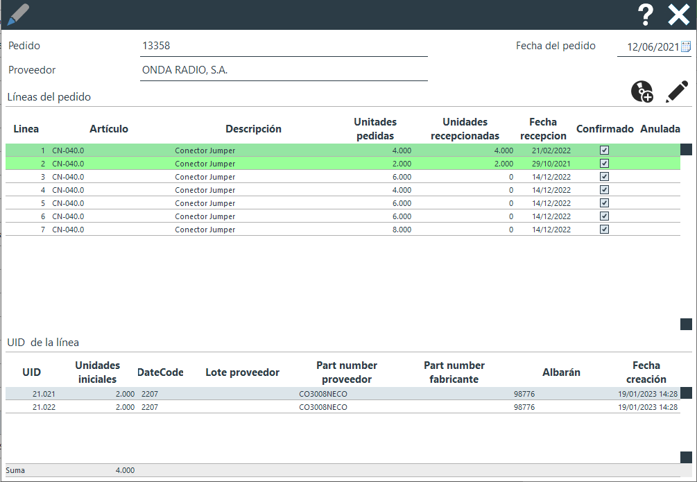 - Tabla 2: En esta tabla se muestran todos los UID creados a partir de la línea del pedido seleccionado en la tabla 1. También se muestra el albarán de entrada asociado a cada UID y la fecha en que se recepcionó. Utiliza esta información para tener un registro completo de los UID relacionados con el pedido.