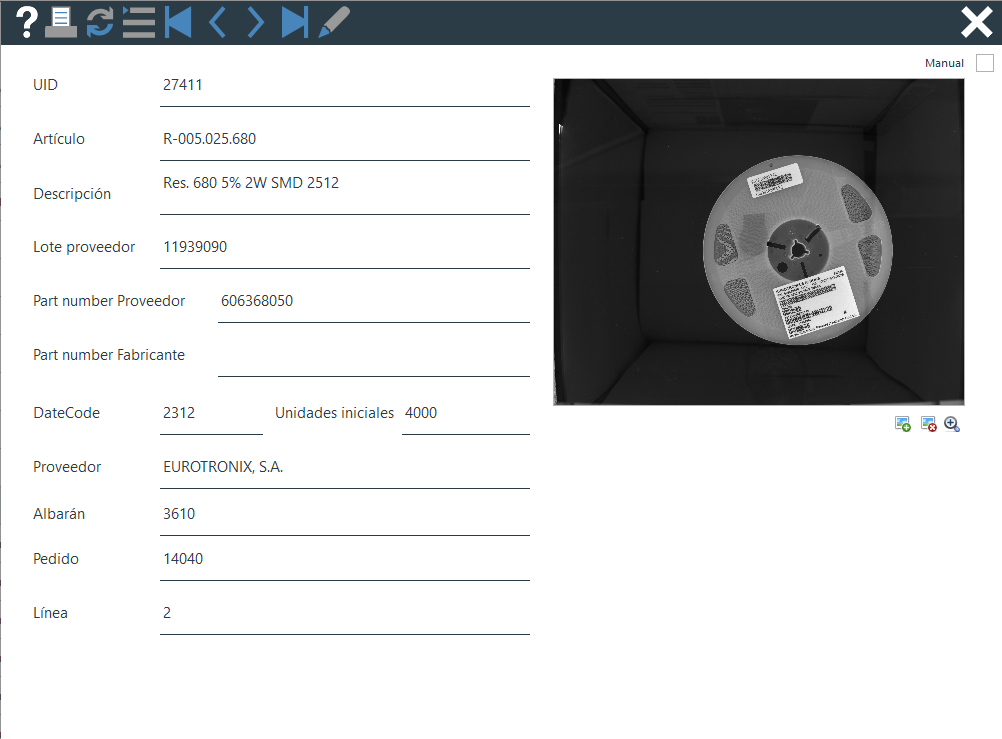 En esta ventana, puedes ver todos los detalles de un UID, como la imagen tomada en el momento de la recepción, los datos leídos (como el lote del proveedor, el datecode, las unidades iniciales, etc.).