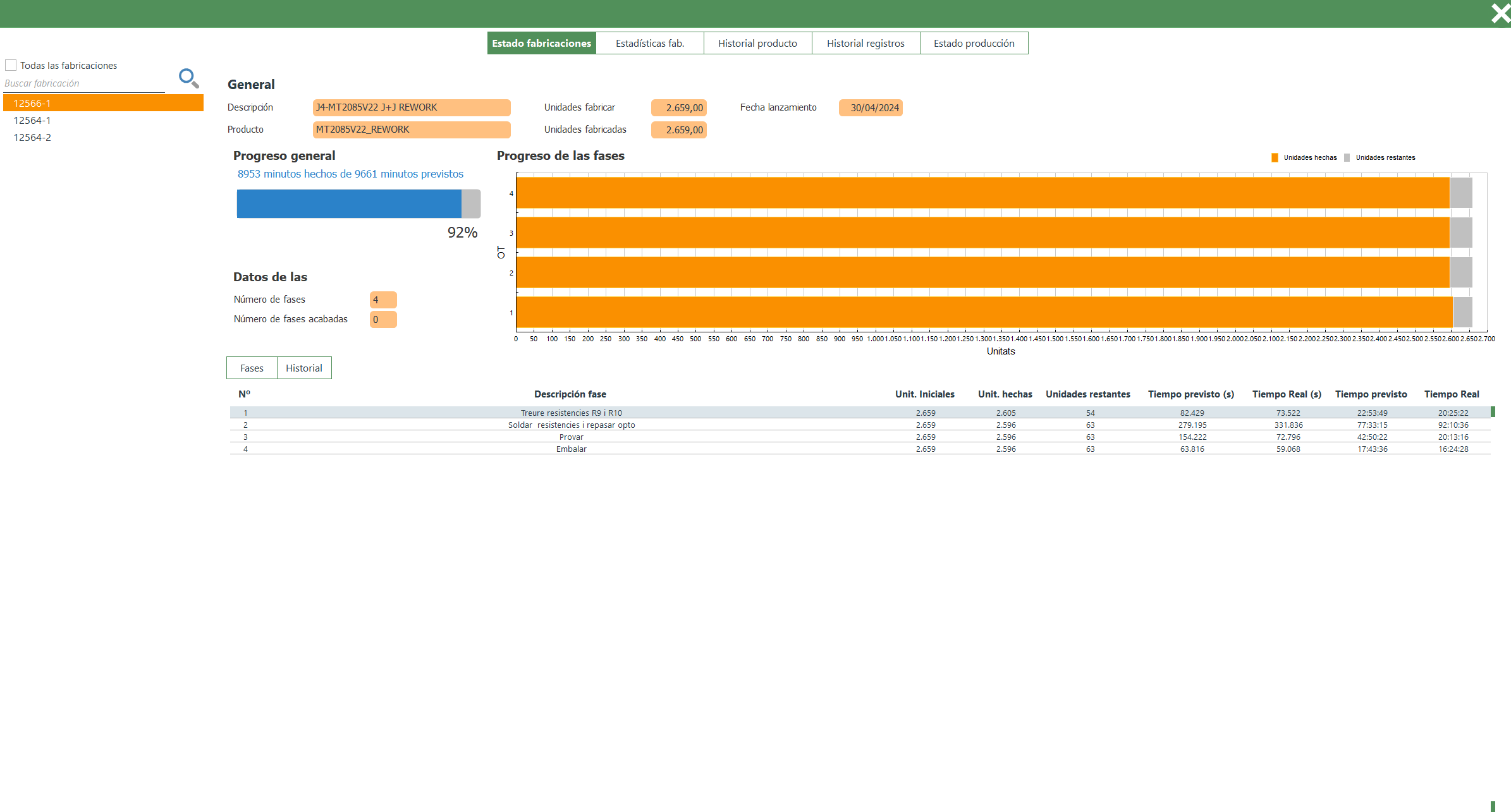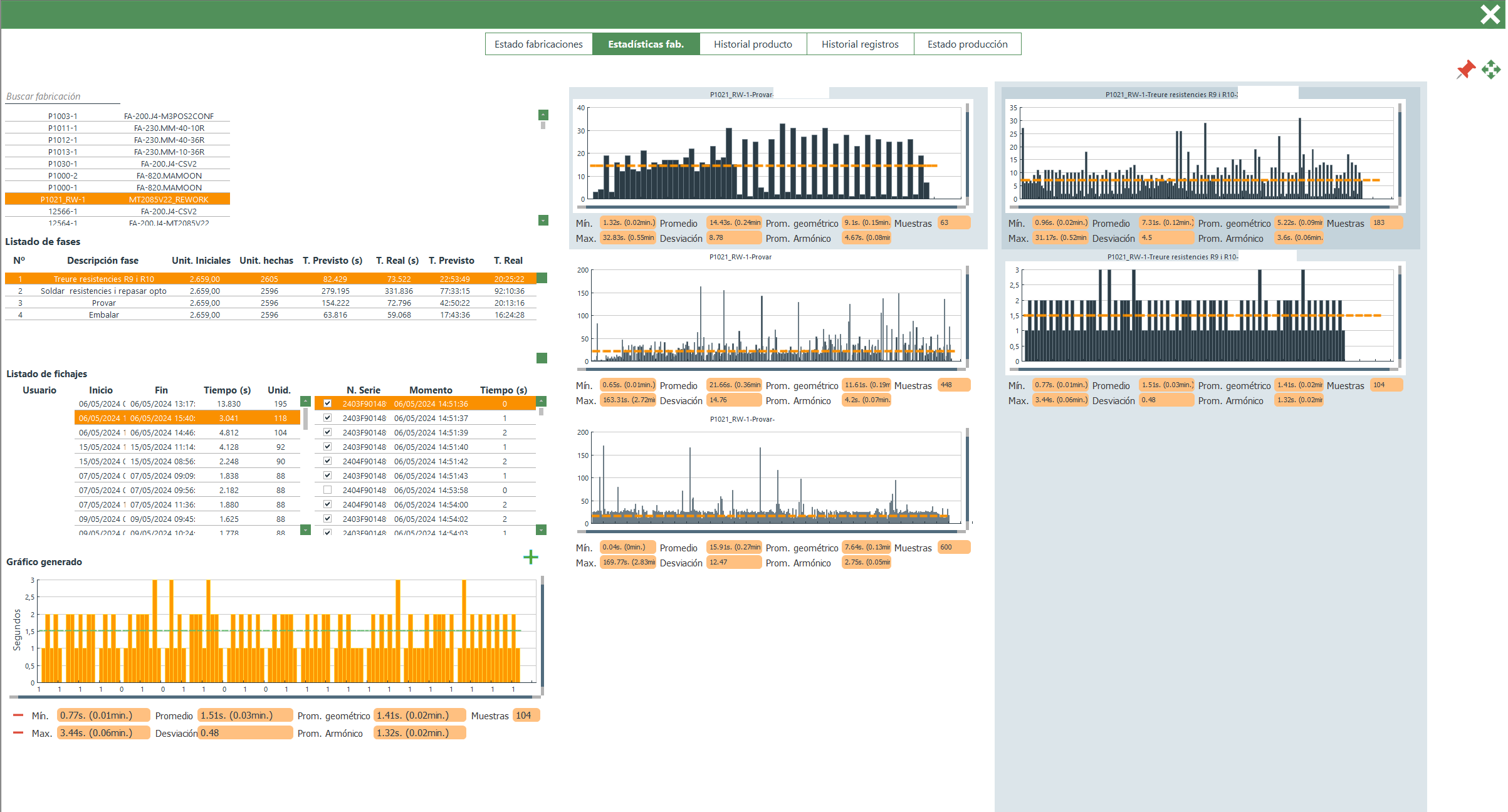 - Genera estadísticas de tiempo en tiempo real, permitiendo visualizar el estado exacto de cada fabricación en cualquier momento. Esto facilita la identificación de posibles retrasos y la optimización de procesos.