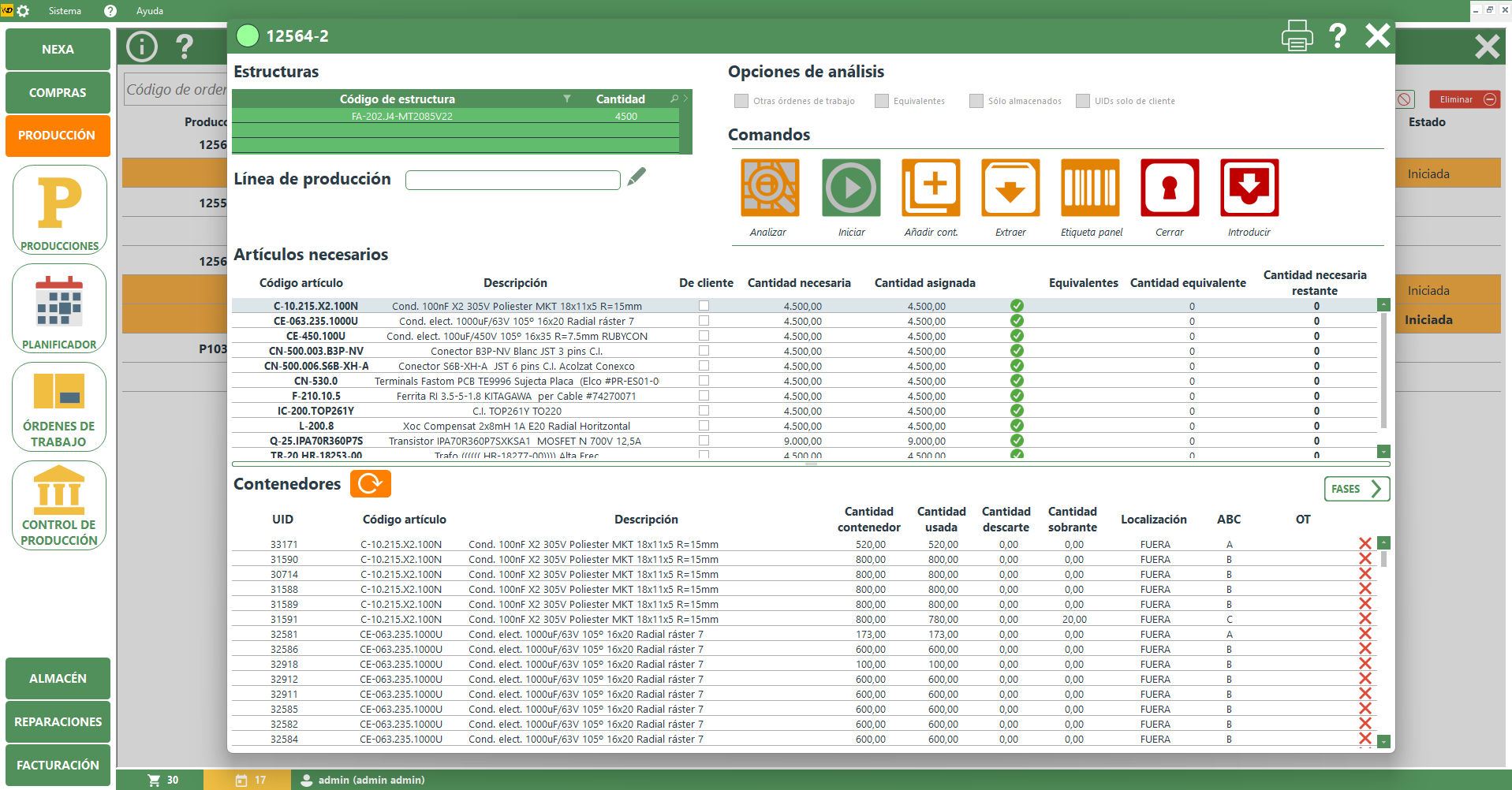 Gestor de Fabricación: Permite la asignación de UID (contenedores únicos) para cada una de las fabricaciones y la gestión del picking (extracción de componentes de todos los almacenes de la empresa). Este módulo se puede conectar con armarios de terceros para gestionar el stock. Además, se encarga de cerrar las órdenes de trabajo completadas, descontando el material utilizado. Para esto, el sistema puede conectarse con máquinas de contador de rayos X para determinar la cantidad exacta de material utilizado, o utilizar el sistema de orden para calcular teóricamente el material sobrante.