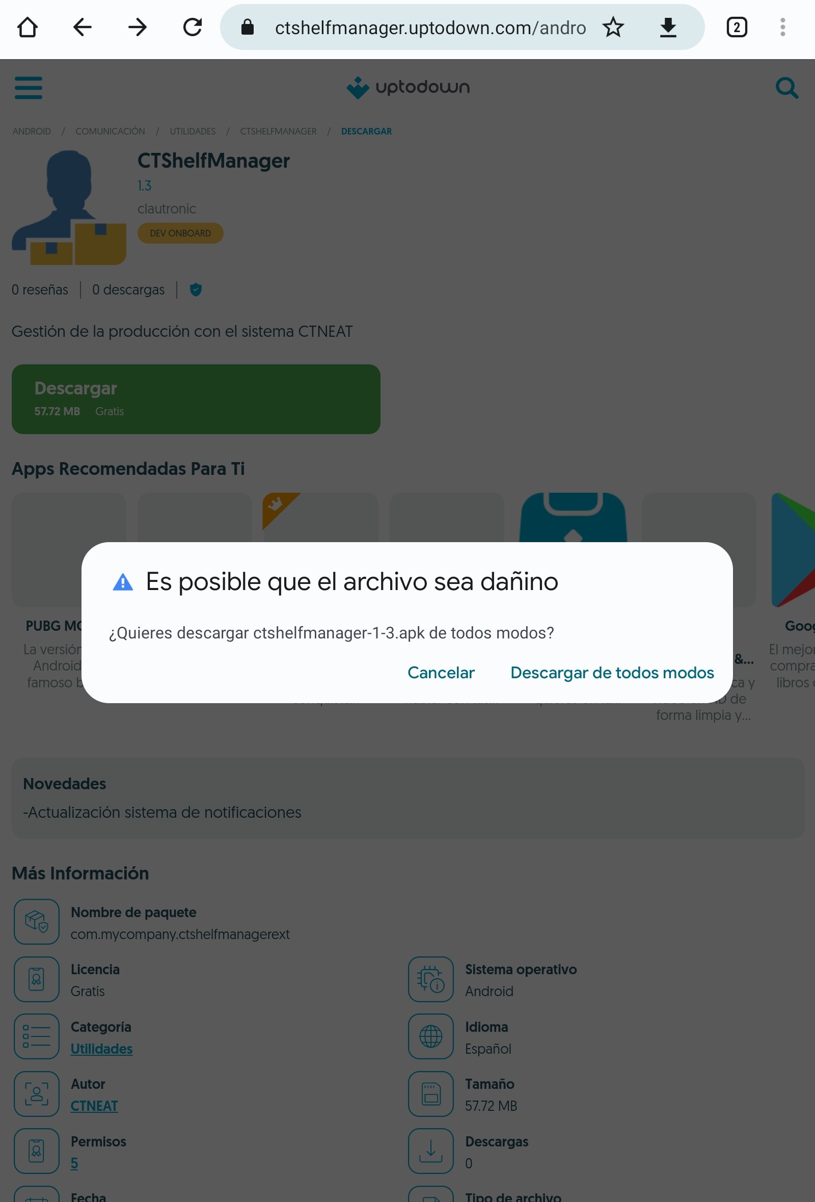 Una vez dentro del sitio web de "Uptodown", buscaremos la aplicación "CTShelfManager" utilizando la función de búsqueda. Una vez encontrada, accederemos a la página dedicada a dicha aplicación.