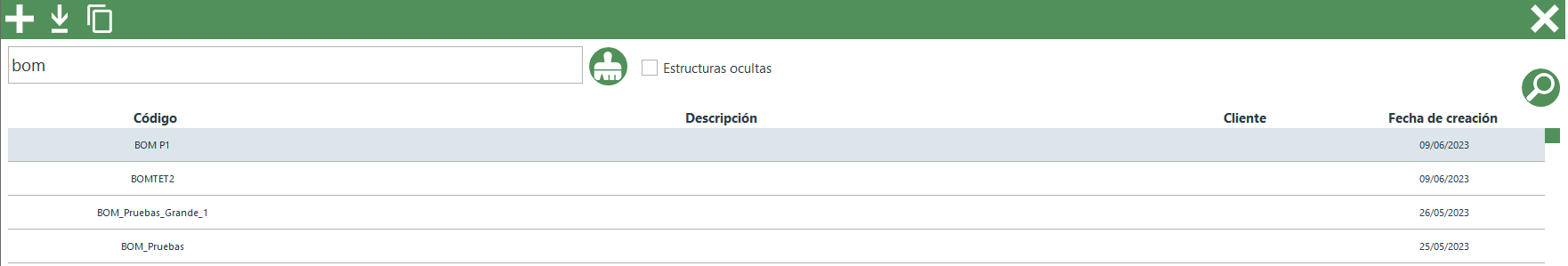 - Nueva lista de materiales: control para acceder a la pantalla de creación de una nueva lista de materiales.