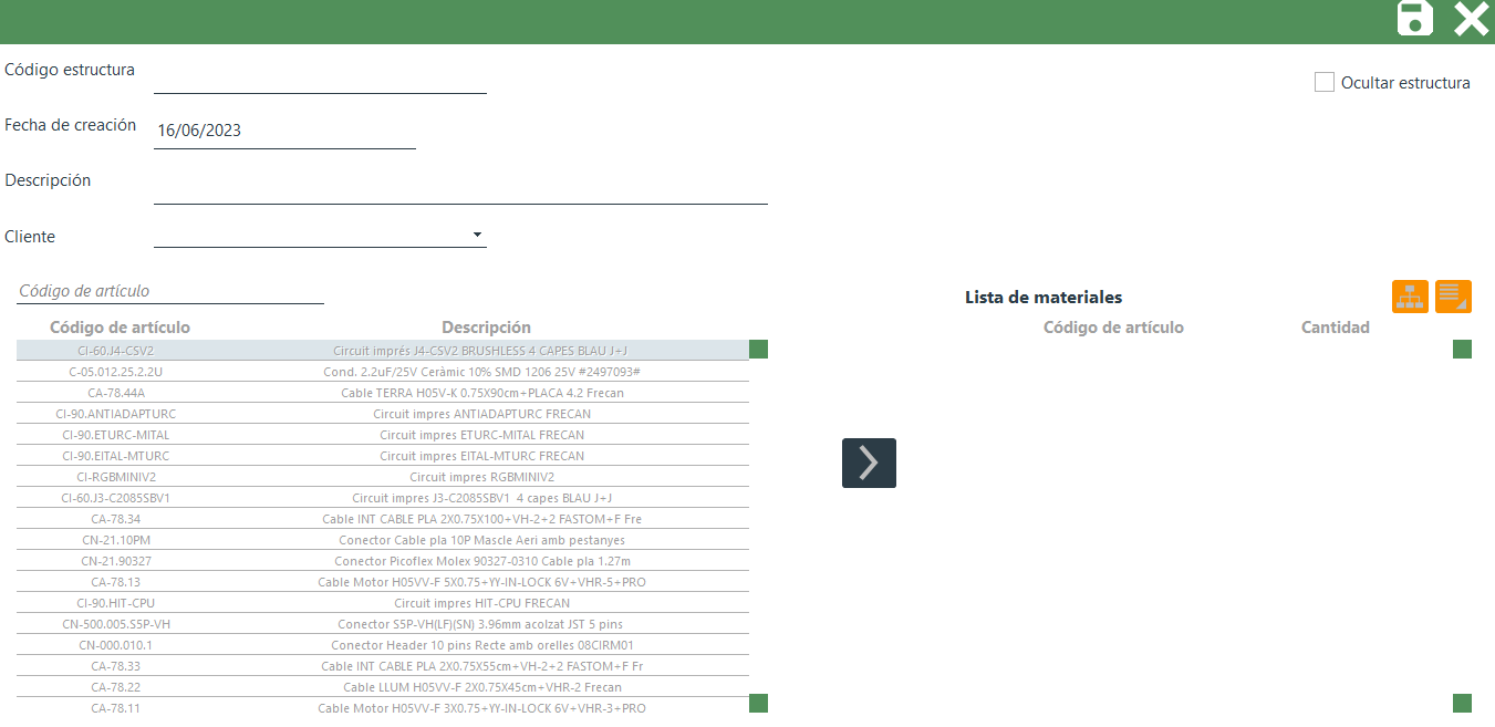 - Añadir artículo: botón para agregar el artículo seleccionado de la tabla de artículos a la lista de materiales.