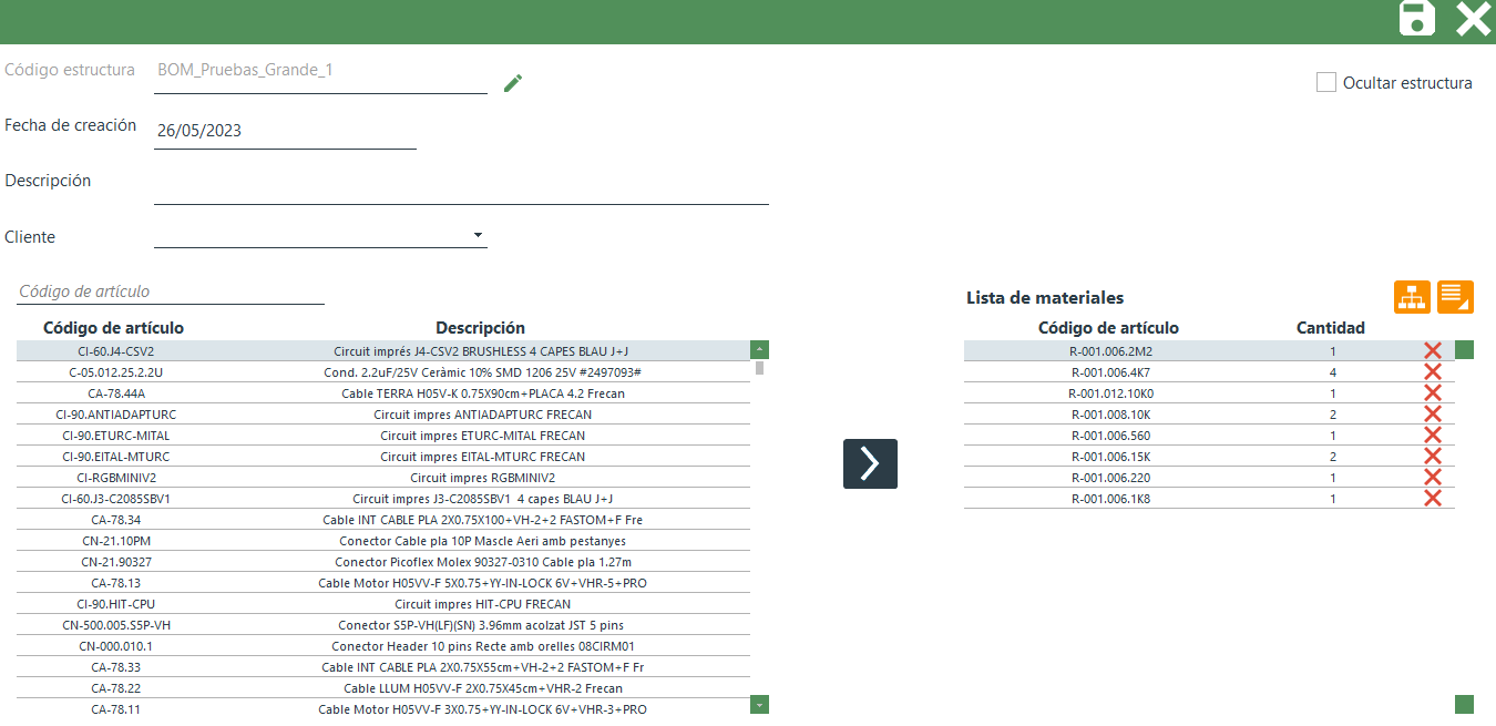 - Lista de materiales: listado de todos los artículos agregados a la lista de materiales en creación.