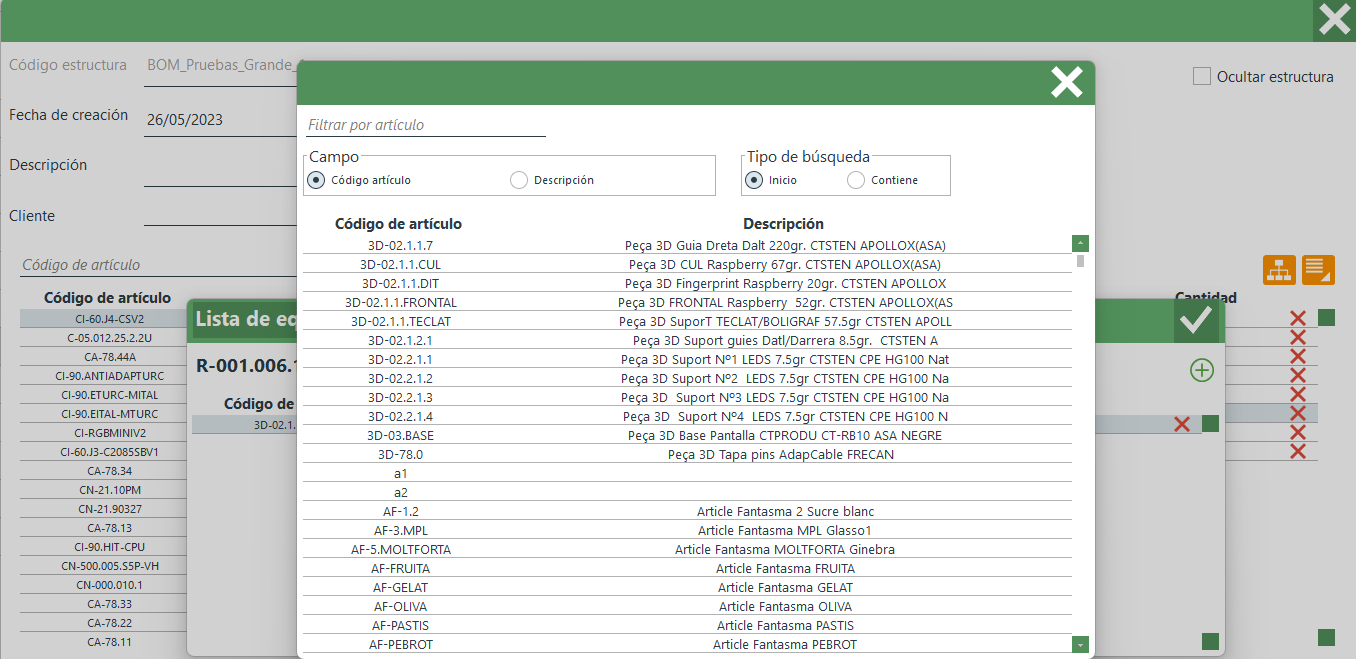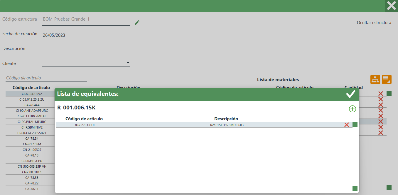 - Asignar equivalente: se pueden asignar uno o varios artículos equivalentes a cada artículo presente en la lista de materiales.