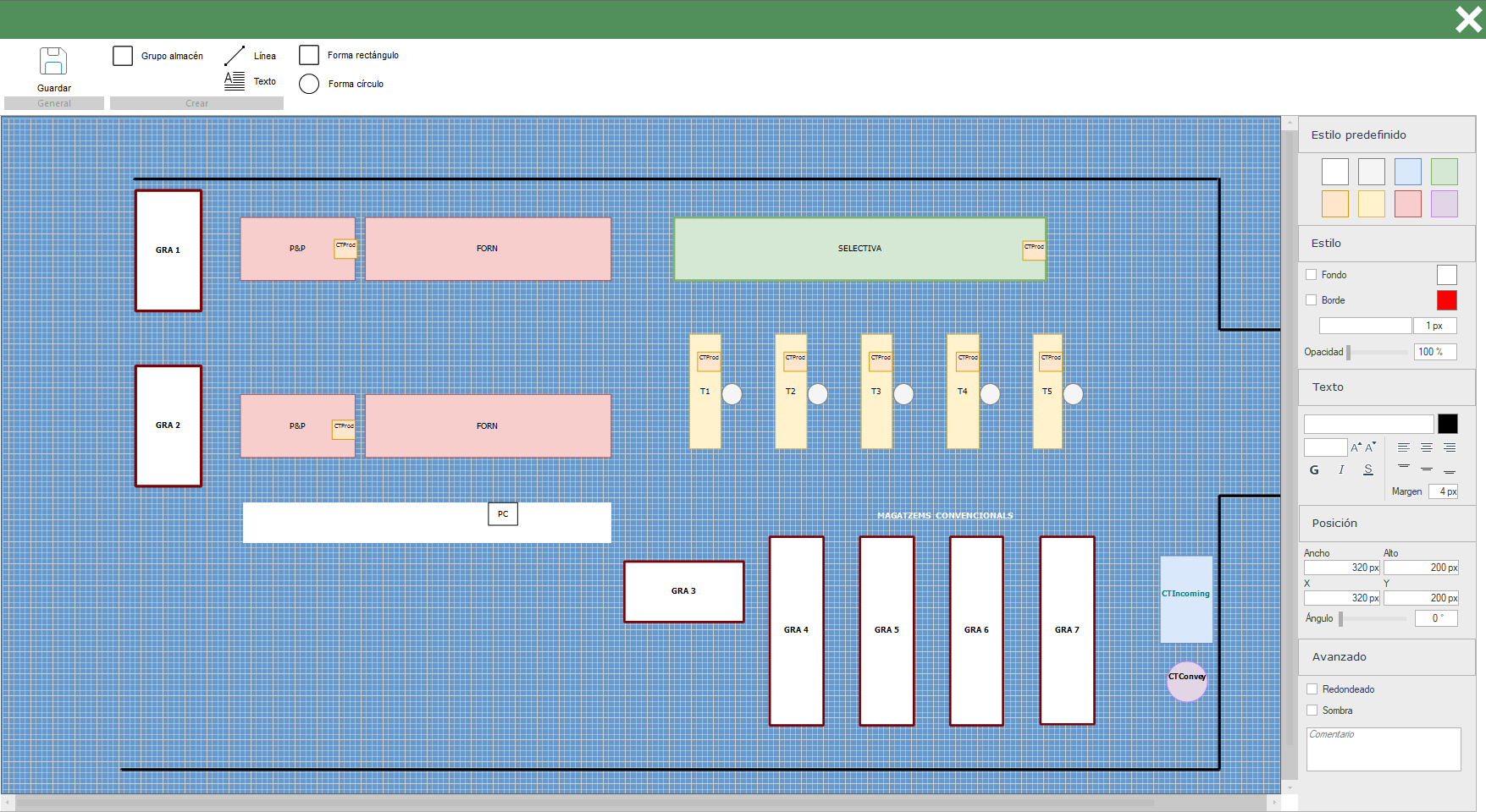 En esta ventana, puedes crear un esquema de tu planta de producción, zona de almacenes, entre otros.