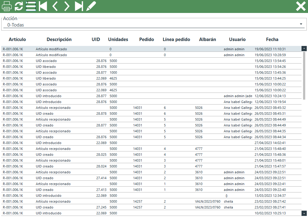 Historial del artículo: Utiliza el control número 2 para acceder al historial del artículo. Al hacerlo, se abrirá una ventana similar a la mostrada en la imagen IV.C.2. En esta ventana, encontrarás una tabla ordenada cronológicamente con los eventos históricos del artículo. Podrás ver quién realizó cada acción, cuándo se llevó a cabo y qué sucedió. Si deseas filtrar los eventos por tipo de acción, utiliza el control número 1 para realizar el filtrado.
