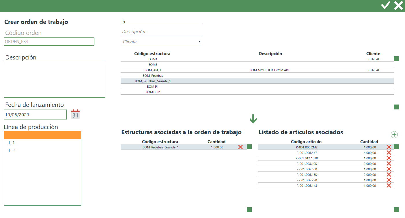 - Listado de estructuras asociadas a la orden de trabajo.