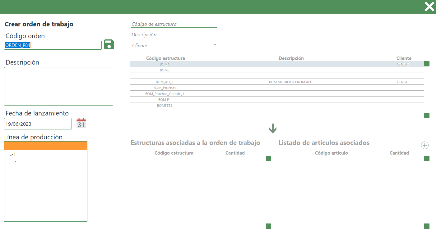 - Línea de producción: campo donde se especifica la línea de producción asignada a la orden de trabajo.