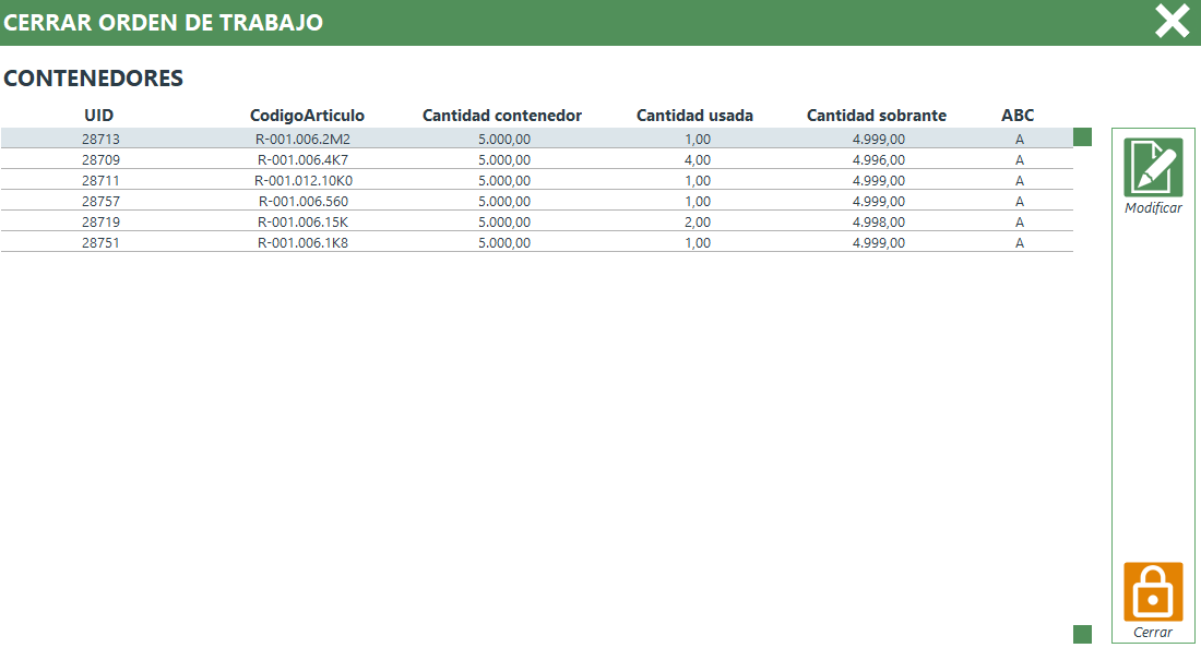 Para finalizar el proceso, deberás hacer clic en el botón "Cerrar". De esta manera, la orden de trabajo pasará al estado de "cerrada", se actualizarán y liberarán todas las cantidades de los contenedores, y aquellos contenedores cuya cantidad sea igual a 0 se desactivarán.