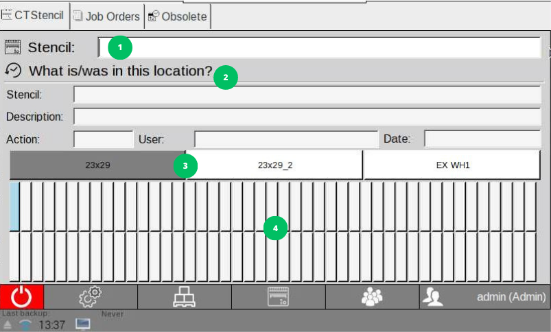Al seleccionar una posición en el esquema del almacén, podrás ver información detallada sobre esa posición en la sección marcada con el número 2. Si hay una pantalla en esa posición, se indicará cuál es y se mostrará quién la insertó y cuándo. En el caso de que no haya ninguna pantalla en la posición seleccionada, se mostrará la información de la última pantalla que estuvo en esa posición, incluyendo quién la extrajo y cuándo.