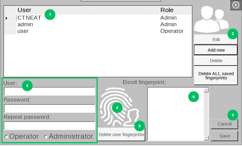 - Una vez finalizado el proceso de registro de la huella (indicado en el recuadro número 6), pulsa el botón de guardar del grupo de controles número 7.